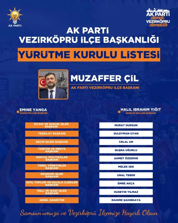 AK Parti Vezirköprü İlçe İcra Kurulu şu isimlerden oluştu: