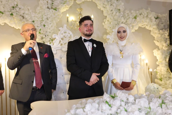 Nikâh cüzdanını geline vermek üzere damada teslim eden önceki dönem Cumhuriyet Başsavcısı Lütfi Dursun, genç çifte ömür boyu huzur dolu bir yuva ve mutluluklar diledi.