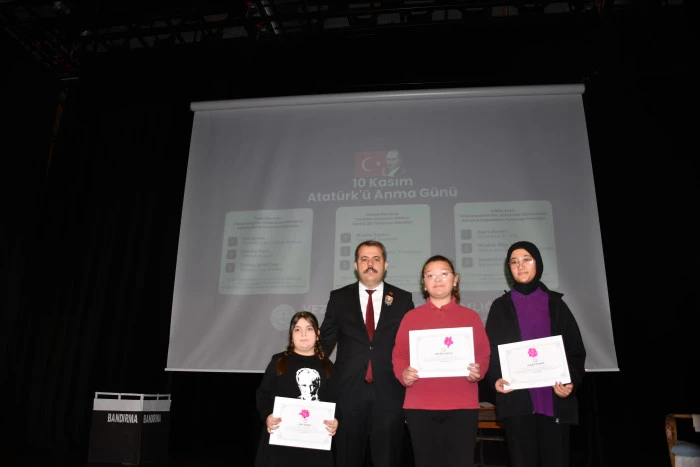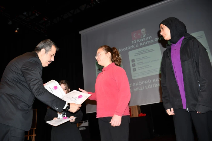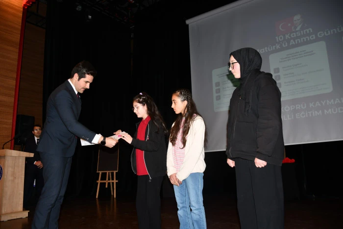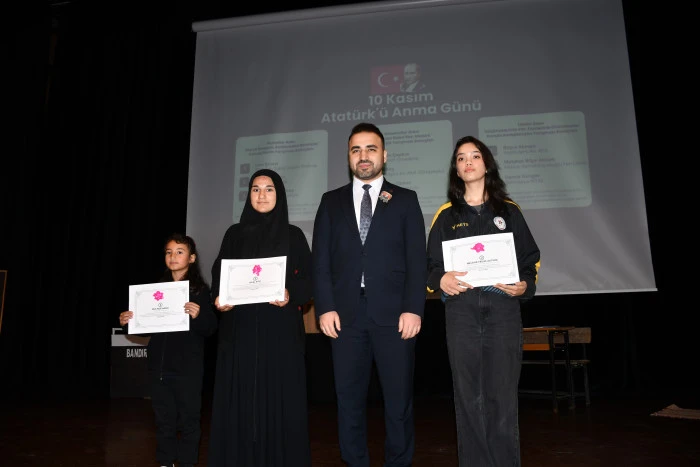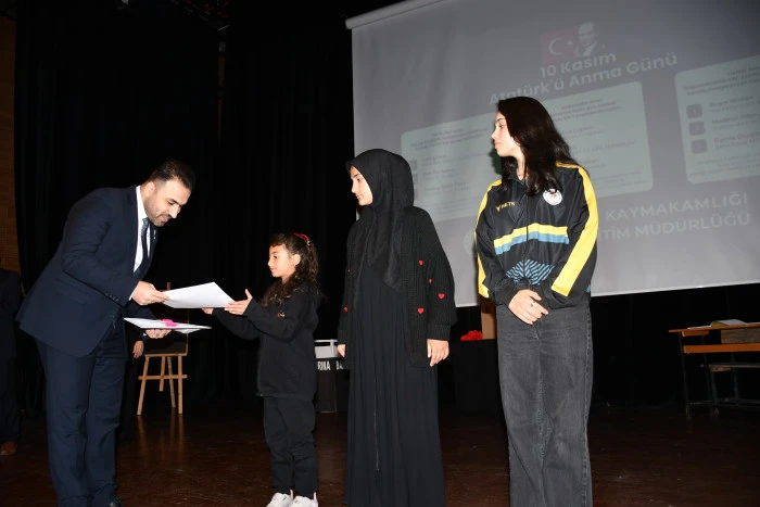 10 Kasım Atatürk’ü Anma etkinlikleri kapsamında ilçe bazında düzenlenen resim, şiir ve kompozisyon yarışmalarında dereceye giren öğrenciler ödüllerini İlçe Kaymakamı Özgür Kaya, Belediye Başkan Murat Gül ve Cumhuriyet Başsavcı Vekili Mehmet Karababa tarafından aldı.