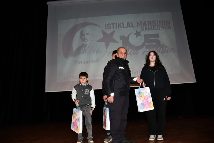 Program, 12 Mart İstiklal Marşı’nın Kabulü ve Mehmet Akif Ersoy’u Anma Günü nedeniyle ilçe bazında düzenlenen “Mehmet Akif ve İstiklal Marşı” konulu yarışmalarda dereceye giren öğrencilere Kaymakam, Belediye Başkanı ve İlçe Emniyet Müdürü tarafından ödüllerin verilmesi ve günün anısına çekilen hatıra fotoğrafı ile sona erdi.
