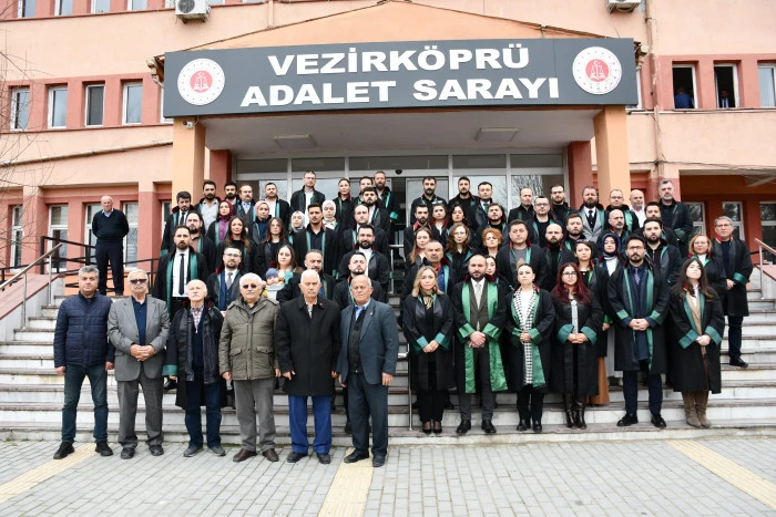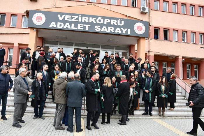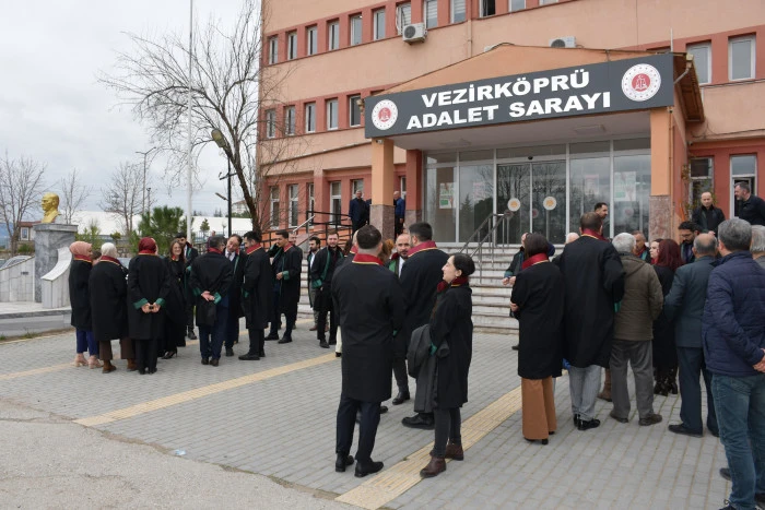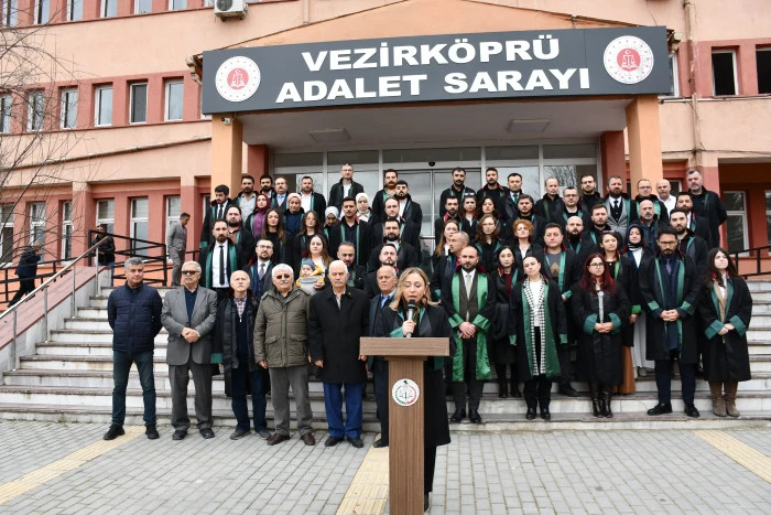 Vezirköprü Adliye Sarayı’nın önünde yapılan açıklamaya Samsun Baro Başkanı Pınar Gürsel Yıldıran ve yönetimi, Vezirköprü Baro Başkanı Oğuz Bakır, CHP Vezirköprü İlçe Başkanı Nazım Kale ve yönetimi Samsun ve Vezirköprü Barosuna kayıtlı avukatlar katıldı.