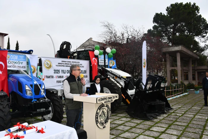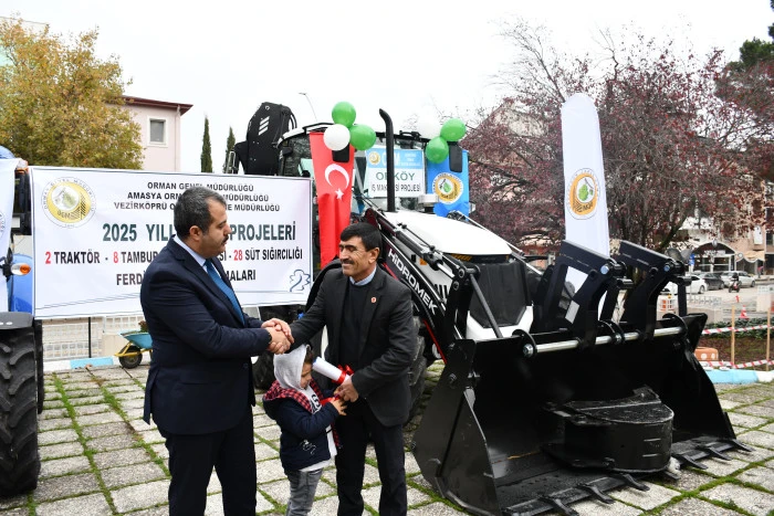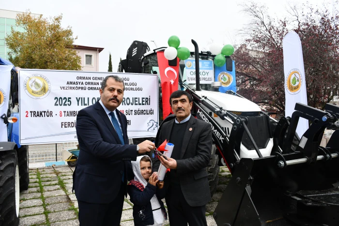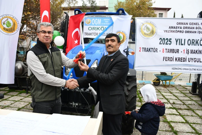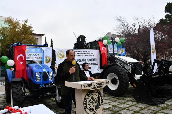 Vezirköprü ilçesinde Orman İşletme Müdürlüğü tarafından Orköy projesi kapsamında orman köylülerine iş makinesi, traktör, tomruk çekme vinci ve süt sığırcılığı desteği sağlandı. Proje kapsamında 1 iş makinesi, 2 traktör, 8 tambur ve 28 süt ineğinin teslimi için tören düzenlendi.