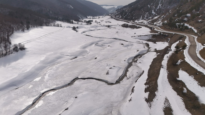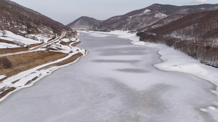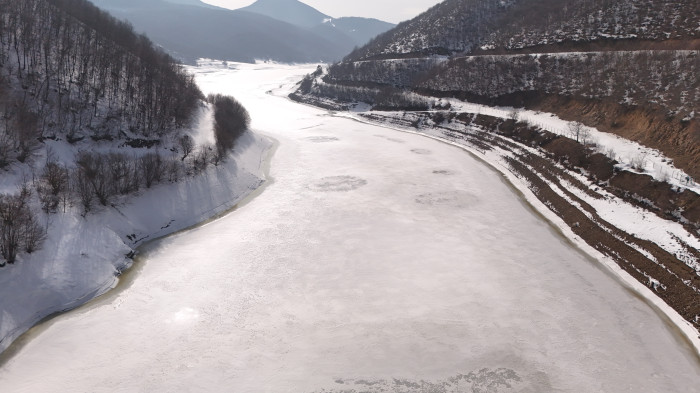Yüzeyi tamamen buzla kaplanan sulama barajı, çevresindeki kar manzarası ile birleşince eşsiz bir doğal güzellik ortaya çıktı.
