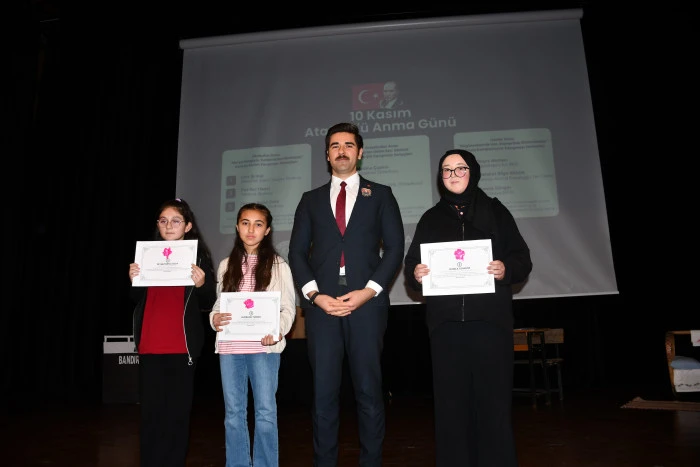 10 Kasım Atatürk’ü Anma etkinlikleri kapsamında ilçe bazında düzenlenen resim, şiir ve kompozisyon yarışmalarında dereceye giren öğrenciler ödüllerini İlçe Kaymakamı Özgür Kaya, Belediye Başkan Murat Gül ve Cumhuriyet Başsavcı Vekili Mehmet Karababa tarafından aldı.