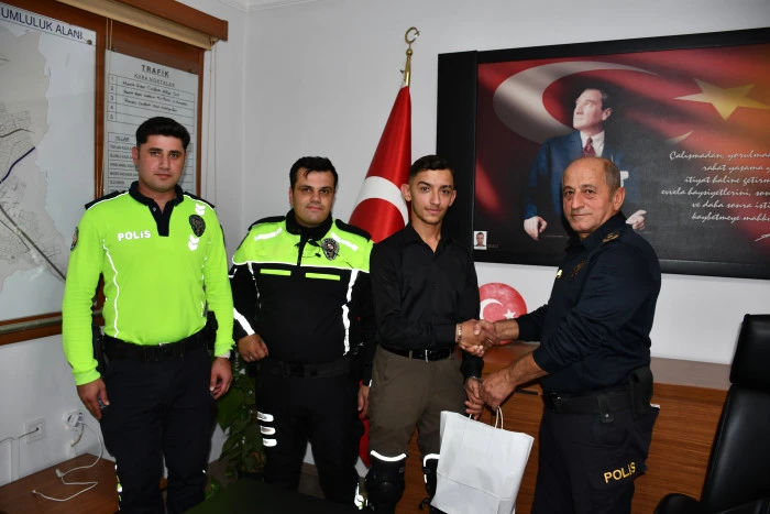 Bu gelişme üzerine Vezirköprü İlçe Emniyet Müdürü Ahmet Çelik, Talha Şişli’yi makamında ağırlayarak gösterdiği örnek davranıştan dolayı tebrik etti ve kendisine hediye takdim etti.