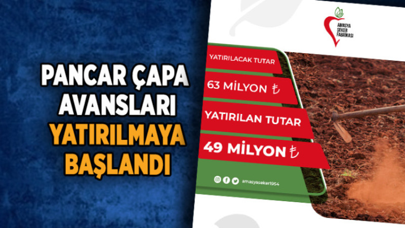 Amasya Şeker Fabrikası Yönetim Kurulu Başkanı Ahmet Özarslan yaptığı yazılı açıklamada, dekar başına 600 lira olan çapa avanslarının hafta boyunca çiftçilerin hesaplarına yatırılacağını açıkladı.