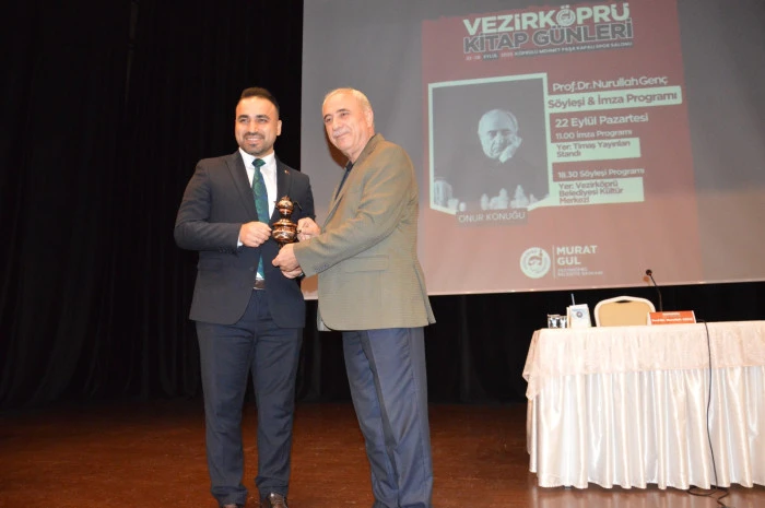 Vezirköprü Belediyesi tarafından 22-28 Eylül tarihleri arasında düzenlenen “Vezirköprü Kitap Günleri” kapsamında, ünlü şair ve yazar Prof. Dr. Nurullah Genç, Vezirköprü Belediyesi Konferans Salonu’nda bir söyleşi programı gerçekleştirdi.