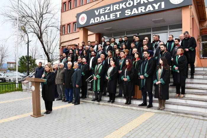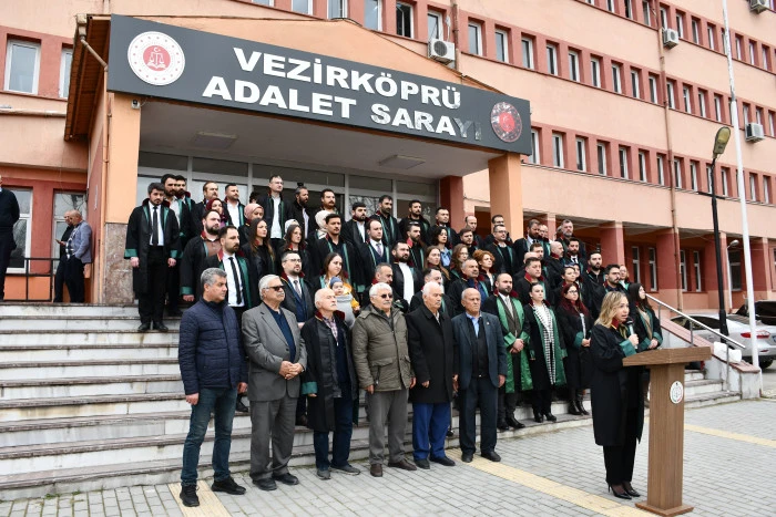 Vezirköprü Adliye Sarayı’nın önünde yapılan açıklamaya Samsun Baro Başkanı Pınar Gürsel Yıldıran ve yönetimi, Vezirköprü Baro Başkanı Oğuz Bakır, CHP Vezirköprü İlçe Başkanı Nazım Kale ve yönetimi Samsun ve Vezirköprü Barosuna kayıtlı avukatlar katıldı.