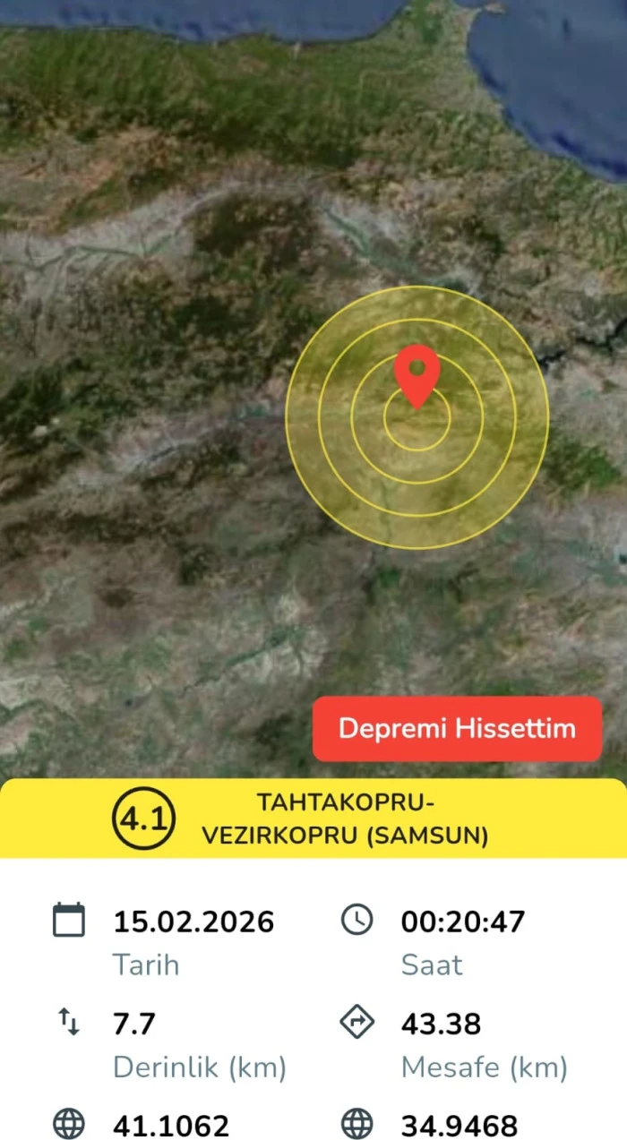 Samsun’un Vezirköprü ilçesinde gece saatlerinde deprem meydana geldi. Afet ve deprem izleme kaynaklarından alınan bilgilere göre, deprem 15 Şubat 2026 tarihinde saat 00.20.47’de kaydedildi.