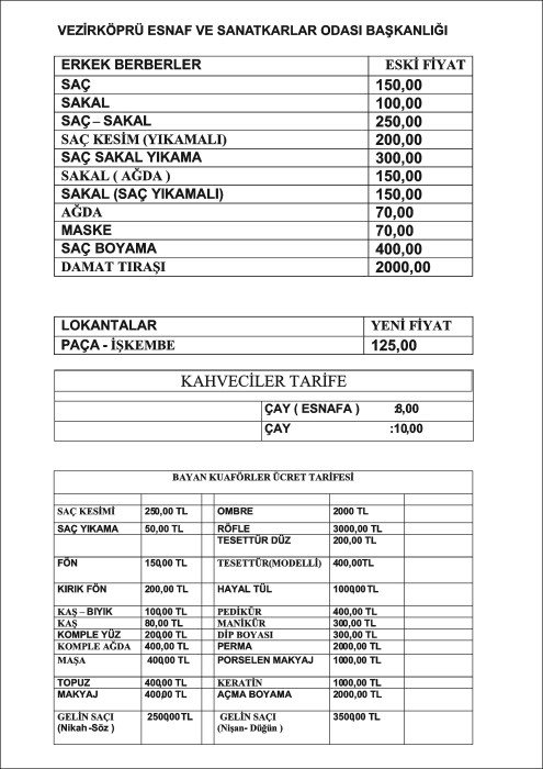 Güncellenen yeni fiyatlara göre kahvehane ve çay ocaklarında çay 10 lira olurken esfana verilen çay ise 8 lira oldu. Lokantalarda ise Vezirköprü’nün vazgeçilmez lezzetlerinden Paça fiyatı 125 lira olurken işkembe fiyatı da 125 tl oldu.