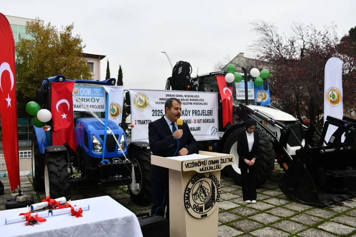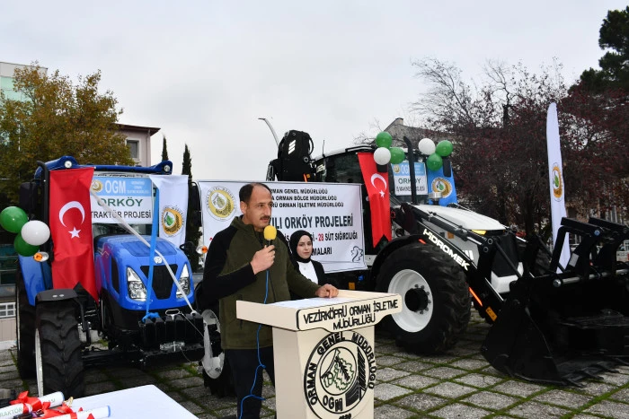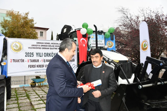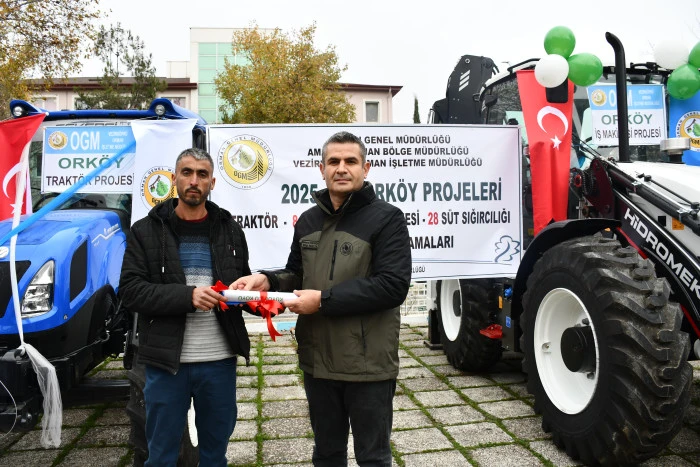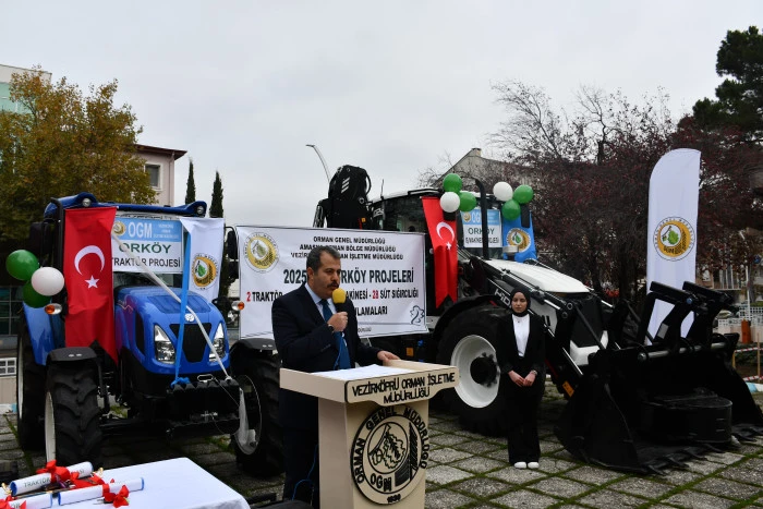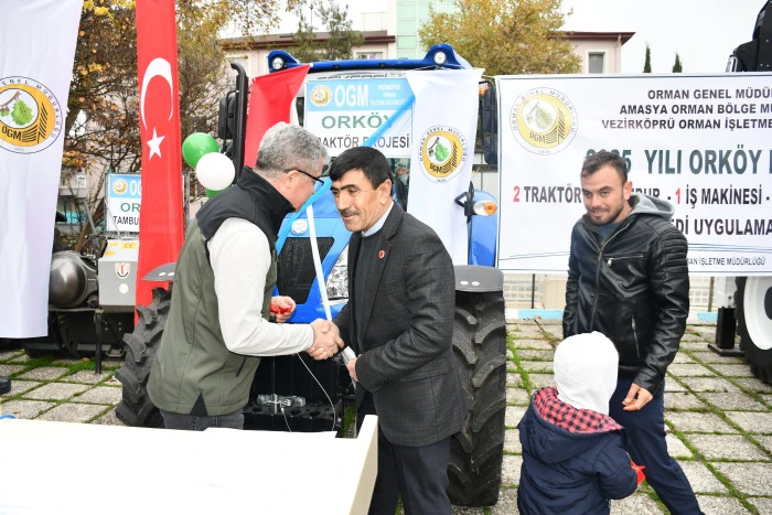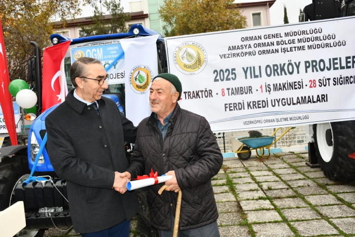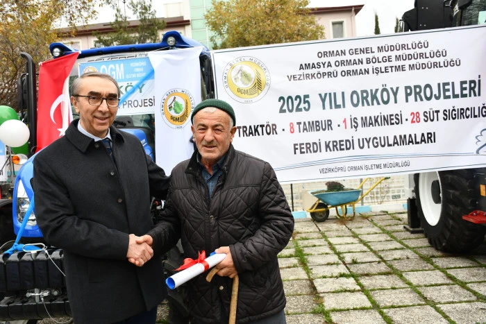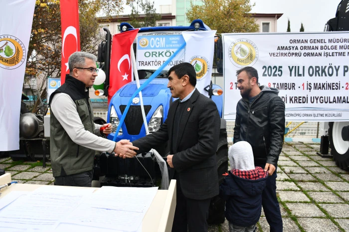 Vezirköprü ilçesinde Orman İşletme Müdürlüğü tarafından Orköy projesi kapsamında orman köylülerine iş makinesi, traktör, tomruk çekme vinci ve süt sığırcılığı desteği sağlandı. Proje kapsamında 1 iş makinesi, 2 traktör, 8 tambur ve 28 süt ineğinin teslimi için tören düzenlendi.